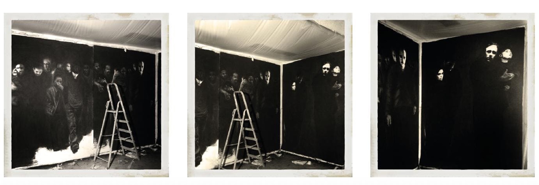 La première œuvre, Nos Ombres, réalisée au fusain et à la pierre noire il y a 9 ans, fait surgir une colonne de réfugiés. Les corps avancent, se resserrent, enjambent la toile. Leur horizon est celui du spectateur.