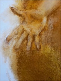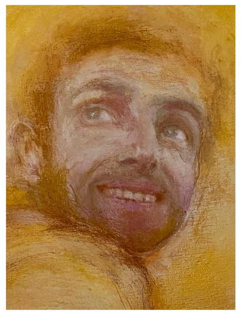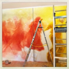 Face à elle, une seconde toile aux pigments de couleur — en train de naître — déploie une farandole en serpentine. Une danse silencieuse apparaît : une main se tend, non pour sauver, mais pour rejoindre. Les corps s’y relient dans un même mouvement, portés par une nécessité plus ancienne que la peur.